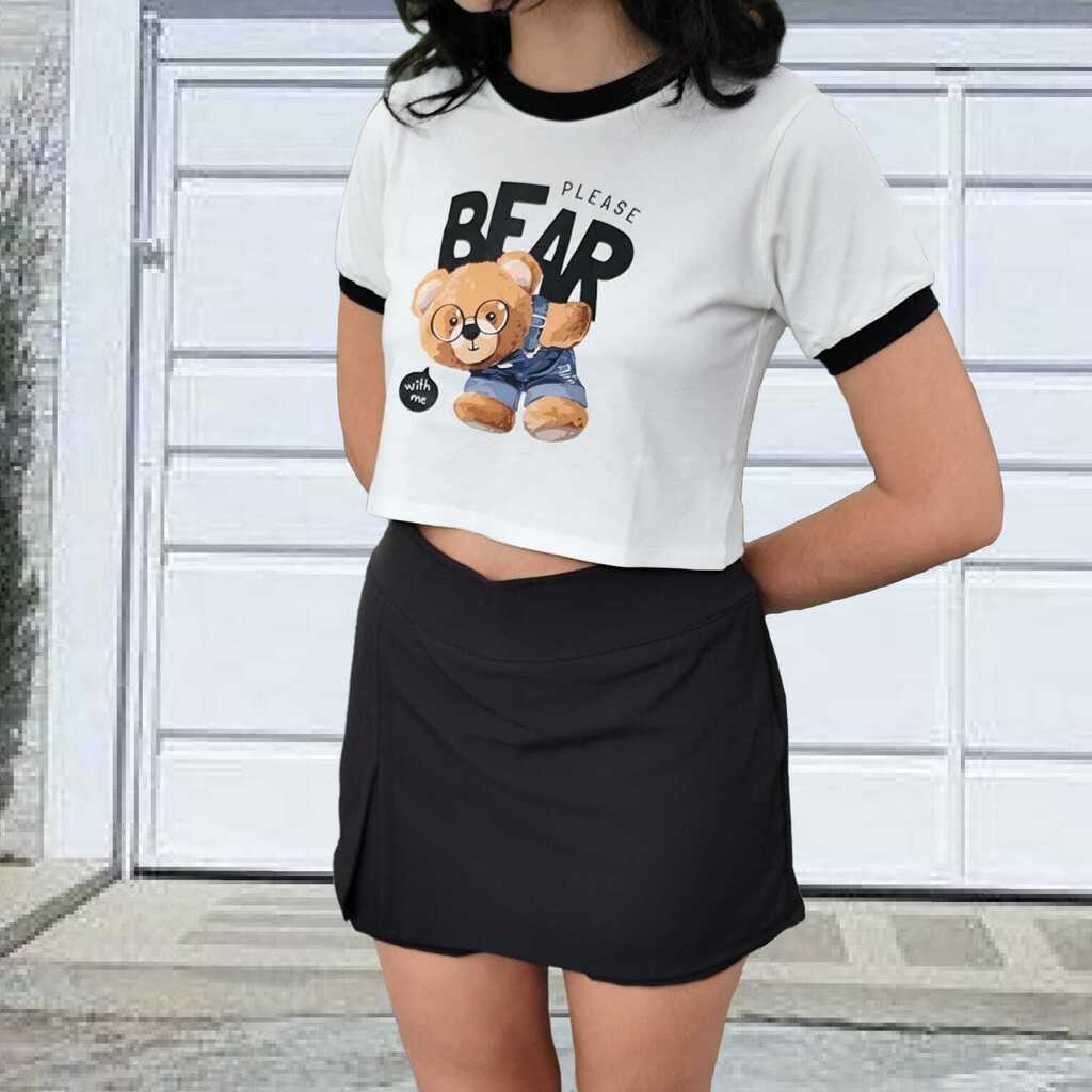 Esta blusa cropped bege com estampa " Please Bear With me" é a escolha perfeita para quem deseja um look fashion e confortável. Com detalhes que fazem toda a diferença, ela se destaca em qualquer ocasião.