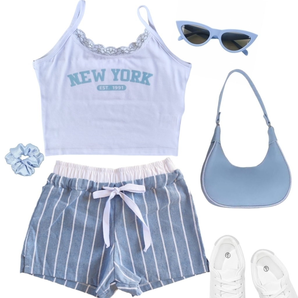 Experimente o Conjunto Regata New York e Short Listrado Azul e transforme seu guarda-roupa com uma combinação que une conforto e elegância. Ideal para passeios, festas ou até mesmo para um dia relaxante em casa!